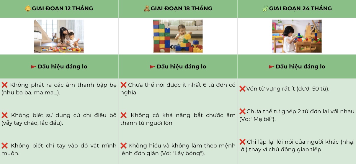 Mỗi đứa trẻ là một cá thể riêng biệt, nhưng nhìn chung, ba mẹ cần đặc biệt lưu ý và cân nhắc đưa trẻ đi đánh giá nếu thấy các dấu hiệu trẻ chậm nói (Red Flags) dưới đây: